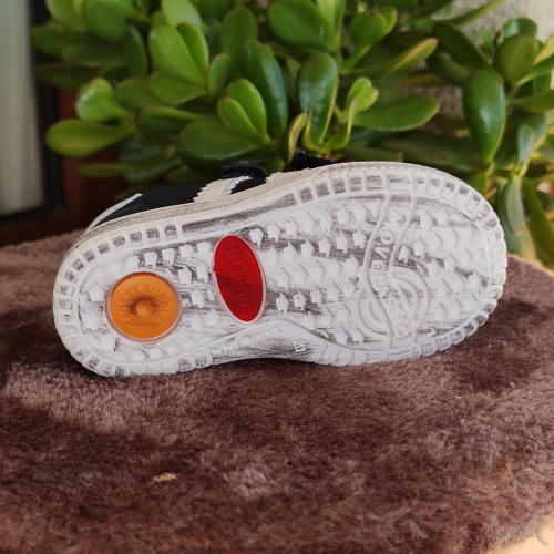 Deportiva combinada en piel con serraje, rayas blancas en el lateral exterior haciendo contraste.  Cierre con dos velcros, suela extra flexible y de efecto manchado.  Ideal para un look casual pero también nos permite ir más sport. Realizado en España