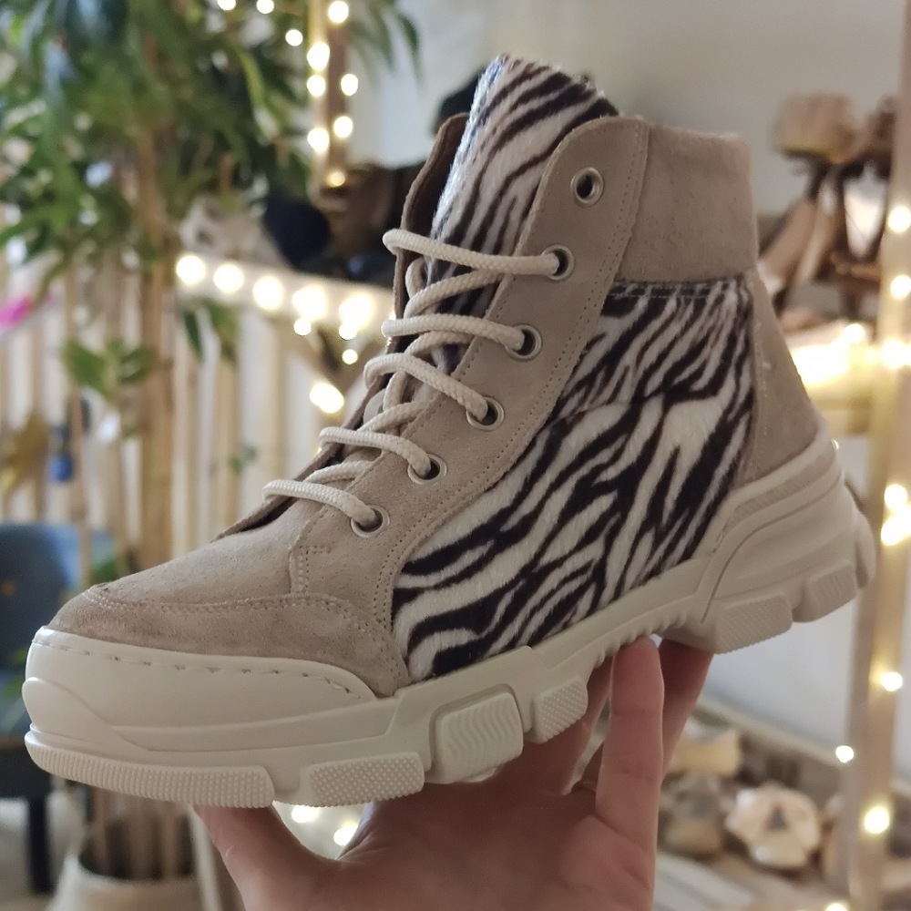 Botín con estampado cebra, cierre con cordones y suela de goma antideslizante y flexible.